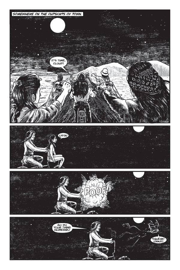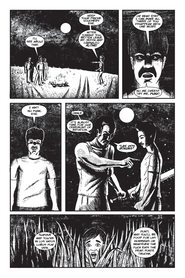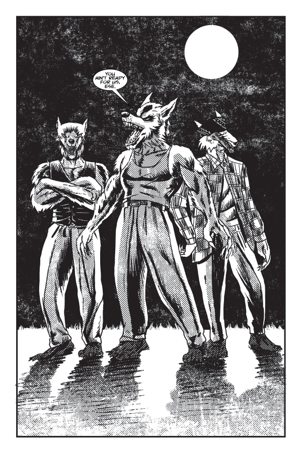 "Sangre de Lobos (Wolves Blood)" is a 28 page, black and white, bilingual horror comic about family, loyalty, friendship and betrayal among other things. There’s also vampires, ghouls, regular folks and cholo-werewolves.