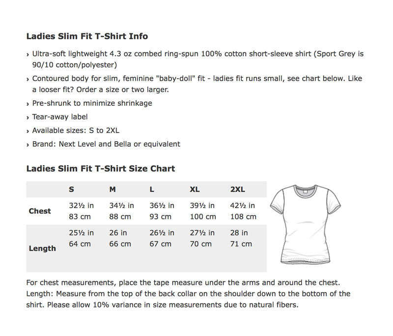 Contoured body for slim, feminine "baby-doll" fit - ladies fit runs small, see chart below. Like a looser fit? Order a size or two larger.