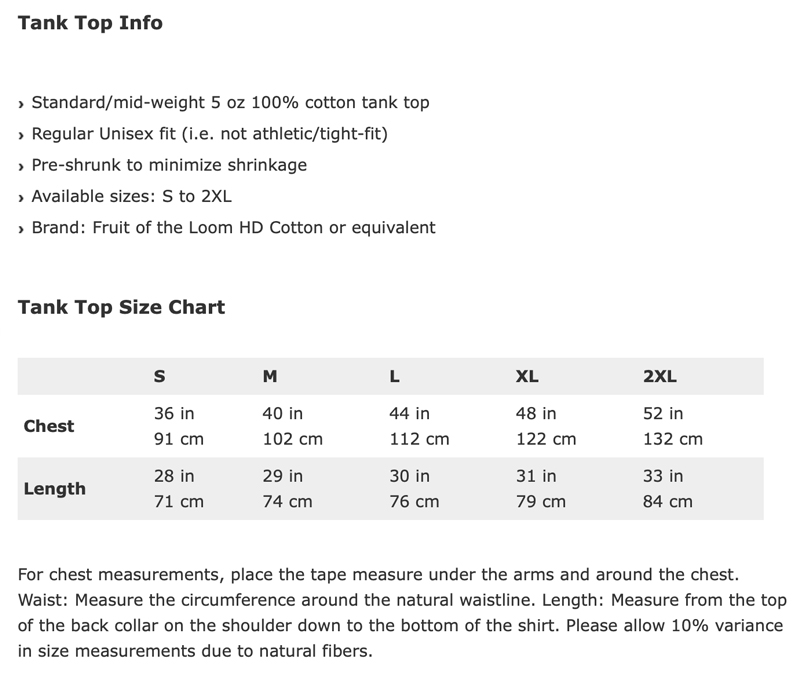 Standard/mid-weight 5 oz 100% cotton tank top Regular Unisex fit (i.e. not athletic/tight-fit) Pre-shrunk to minimize shrinkage Available sizes: S to 2XL Brand: Fruit of the Loom HD Cotton or equivalent