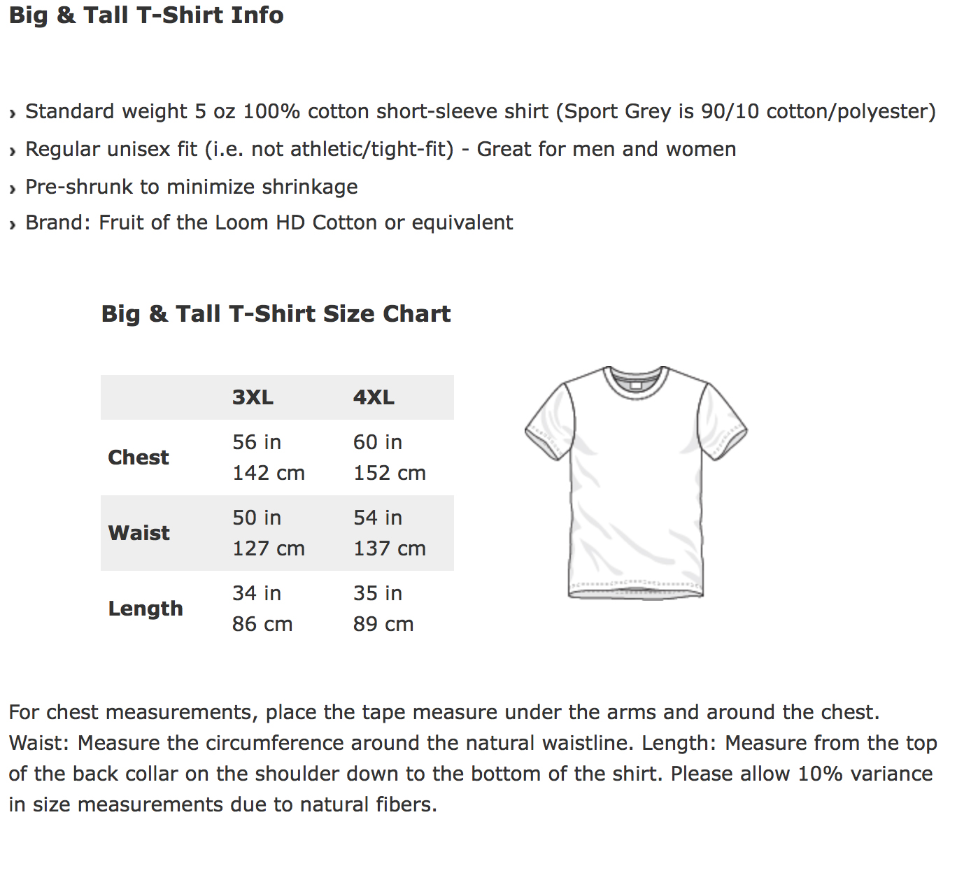 Sizes 2XL, 3XL, 4XL and 5XLare also available (in some colors) printed on cotton tees and are priced higher.
